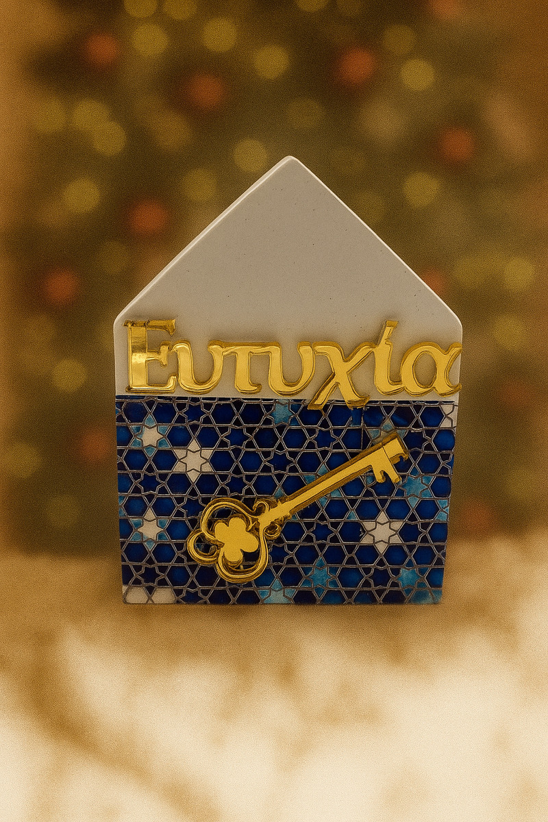 ΕΠΙΤΡΑΠΕΖΙΟ ΚΕΡΑΜΙΚΟ ΓΟΥΡΙ ΣΠΙΤΑΚΙ ΜΕ ΜΠΛΕ ΑΣΤΕΡΑΚΙΑ ΚΑΙ PLEXIGLASS ΕΥΤΥΧΙΑ & ΚΛΕΙΔΙ 7x10cm